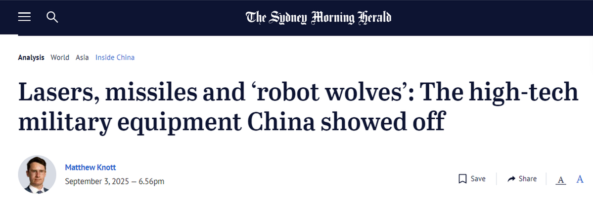 澳大利亞《悉尼先驅(qū)晨報(bào)》報(bào)道稱,中國(guó)閱兵式上展示了彈道導(dǎo)彈、激光武器、戰(zhàn)斗機(jī)、水下無(wú)人潛航器,甚至還有“機(jī)器狼”。