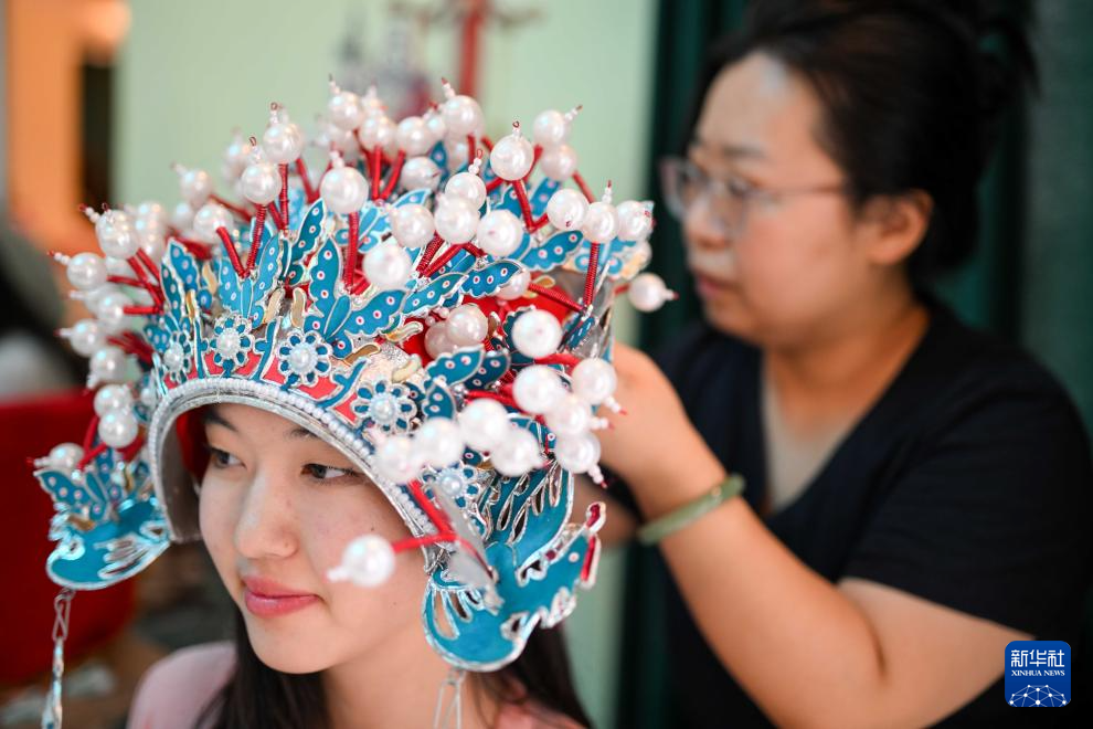 9月18日,在吉爾吉斯斯坦奧什國立大學(xué)孔子學(xué)院,一名教師為學(xué)生佩戴晚會活動上用的頭冠。新華社記者 李任滋 攝
