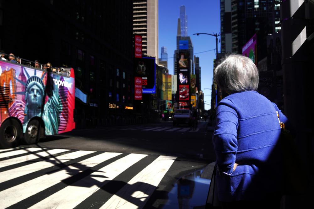 10月1日,在美國紐約曼哈頓的時報廣場附近,行人等待通過人行橫道斑馬線過馬路。新華社記者吳曉凌攝