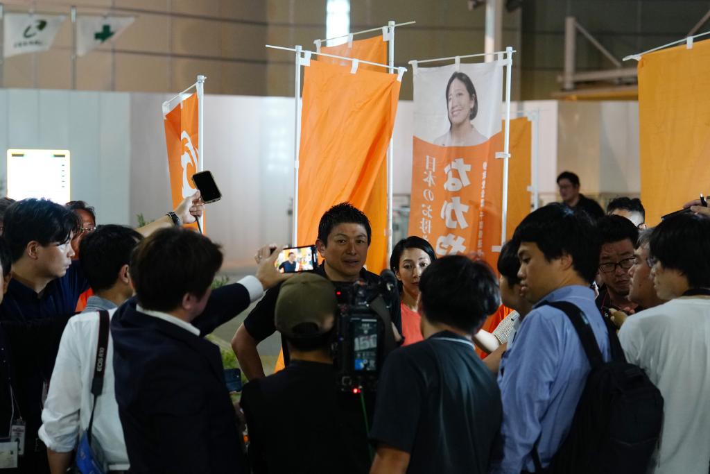 7月13日,在日本千葉縣,參政黨黨首神谷宗幣(中)在街頭演說活動后接受媒體采訪。新華社記者賈浩成攝
