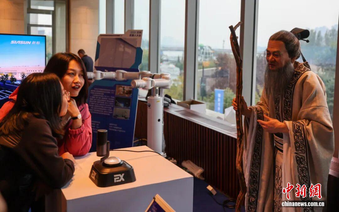 2025年10月17日,2025沈陽(yáng)機(jī)器人大會(huì)在遼寧沈陽(yáng)開(kāi)幕。圖為觀眾與交互型仿生人形機(jī)器人孔子互動(dòng)。 中新社記者 于海洋 攝