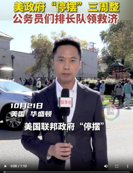 21日,美國(guó)聯(lián)邦政府“停擺”已整整三周。當(dāng)天午間,新華社記者在首都華盛頓東郊一處救濟(jì)點(diǎn)看到,被拖欠工資的聯(lián)邦雇員排起了數(shù)十米長(zhǎng)隊(duì),領(lǐng)取免費(fèi)食品以解“燃眉之急”。
