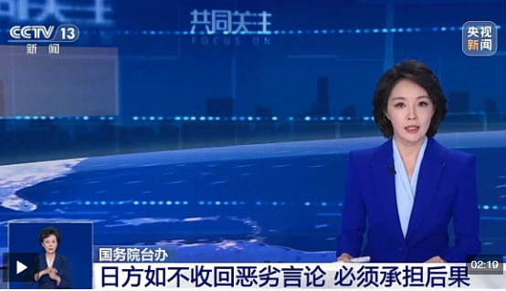 日本在臺(tái)灣問題上對(duì)中國人民負(fù)有歷史罪責(zé)。甲午戰(zhàn)爭后,日本強(qiáng)行侵占臺(tái)灣并進(jìn)行長達(dá)半個(gè)世紀(jì)的殖民統(tǒng)治。日據(jù)時(shí)期,臺(tái)灣人民災(zāi)難深重,數(shù)十萬同胞被殺害,民眾淪為“亡國奴”、毫無政治權(quán)利、信仰自由和文化自由,寶島的礦產(chǎn)資源、民生物資遭瘋狂掠奪。日本侵略者在臺(tái)灣犯下的罪行罄竹難書,是臺(tái)灣歷史最黑暗的一頁。包括臺(tái)灣同胞在內(nèi)的全體中國軍民浴血奮戰(zhàn),打敗了日本軍國主義侵略者,贏得抗日戰(zhàn)爭偉大勝利,光復(fù)臺(tái)灣。在抗戰(zhàn)勝利、臺(tái)灣光復(fù)80周年之際,日方不是反省罪惡歷史、吸取慘痛教訓(xùn),其首相高市早苗反而拋出涉臺(tái)露骨言論且態(tài)度惡劣,妄圖介入臺(tái)海局勢(shì)、否定抗戰(zhàn)勝利成果、挑戰(zhàn)戰(zhàn)后國際秩序。對(duì)此,中國政府、中國人民決不答應(yīng)、決不容忍、決不姑息。日方如不立即糾正錯(cuò)誤,收回惡劣言論,必須承擔(dān)由此引發(fā)的一切后果。如其膽敢武力介入臺(tái)灣問題,我們必將予以迎頭痛擊、堅(jiān)決粉碎。