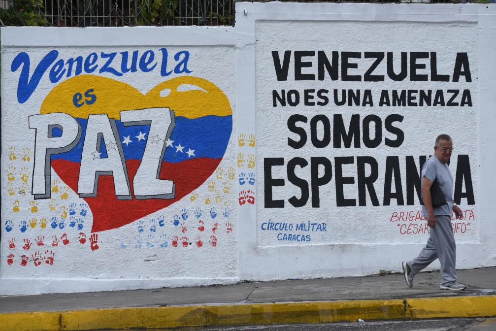 2025年9月22日,在委內瑞拉首都加拉加斯,行人從街頭的宣傳標語前走過。標語上寫著“委內瑞拉是和平國度”“委內瑞拉不是威脅,而是希望”。新華社發(fā)(馬科斯·薩爾加多攝)
