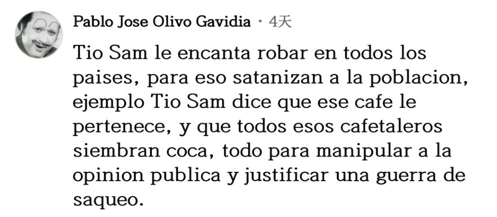 網(wǎng)友巴勃羅·奧利沃留言說:“山姆大叔喜歡在所有國家盜竊,為此他們妖魔化民眾,譬如山姆大叔說那片咖啡園是屬于他的,還說所有那些咖啡農在種植古柯,所有這一切都是為了操弄輿論,為了給他們的掠奪戰(zhàn)爭辯護?!?/p>