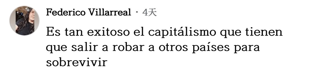 網(wǎng)友費德里科·比利亞雷亞爾不禁感慨道:“資本主義如此成功,以至于他們必須去搶劫其他國家才能生存下去?!?/p>