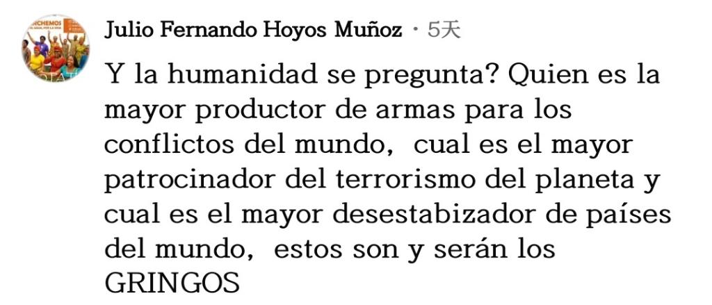 網(wǎng)友胡里奧·奧約斯接連發(fā)問:“沒有人去責問嗎?誰是為世界各地沖突提供武器的全球最大武器制造者?誰是地球上最大的恐怖主義活動支持者?誰是世界上最大的不穩(wěn)定因素制造者?答案無論在現(xiàn)在還是將來,都是美國?!?/p>