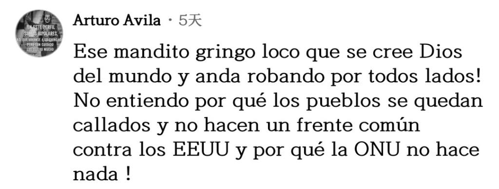 網(wǎng)友阿爾圖羅·阿維拉表達不解:“美國自以為是世界之神,到處掠奪!我不明白為什么各國人民依然保持沉默,而不是組成一個共同陣線對抗美國?!?/p>