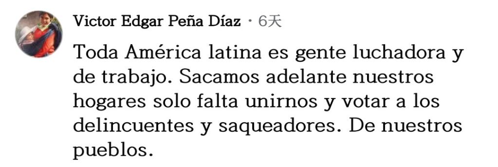 網(wǎng)友維克托·培尼亞留言說:“所有拉美人民都是勞動者和奮斗者,我們靠自己的努力養(yǎng)家糊口?,F(xiàn)在只差團結起來,把那些掠奪我們的罪犯和強盜趕跑?!?/p>
