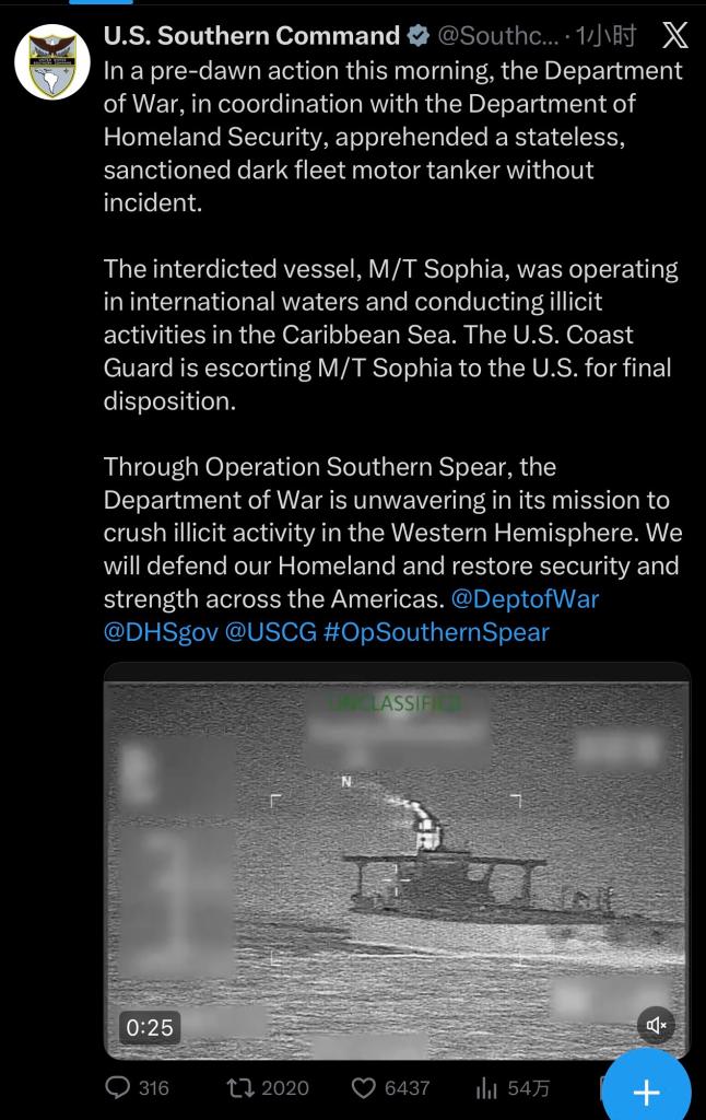 美國(guó)歐洲司令部當(dāng)天在社交媒體上說:“美國(guó)司法部和國(guó)土安全部在與戰(zhàn)爭(zhēng)部的協(xié)調(diào)下,當(dāng)天宣布扣押了‘貝拉1’號(hào)油輪,理由是其違反美國(guó)制裁。該船被美國(guó)海岸警衛(wèi)隊(duì)‘芒羅’號(hào)追蹤后,在北大西洋海域被扣押,依據(jù)是聯(lián)邦法院簽發(fā)的逮捕令?!?/p>