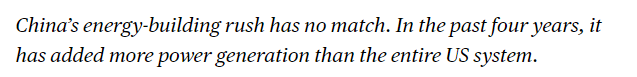 文章說,中國的能源建設(shè)速度無與倫比。過去四年,中國新增的發(fā)電容量超過了整個(gè)美國電力系統(tǒng)的總和。這種大規(guī)模能源基礎(chǔ)設(shè)施投資幫助中國降低對化石燃料依賴,為人工智能數(shù)據(jù)中心等高耗能技術(shù)提供穩(wěn)定電力供應(yīng),從而在全球科技競爭中獲得顯著優(yōu)勢。