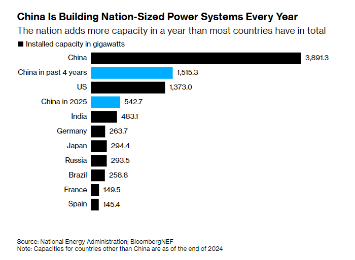文章援引中國國家能源局日前公布的數(shù)據(jù),2025年,中國各類技術(shù)新增發(fā)電裝機(jī)容量達(dá)到543吉瓦(GW)。這一數(shù)字比截至2024年底印度全國所有發(fā)電廠的總?cè)萘窟€要高出12%。自2021年底以來,中國新增的發(fā)電容量也已超過整個(gè)美國電力系統(tǒng)的總量。