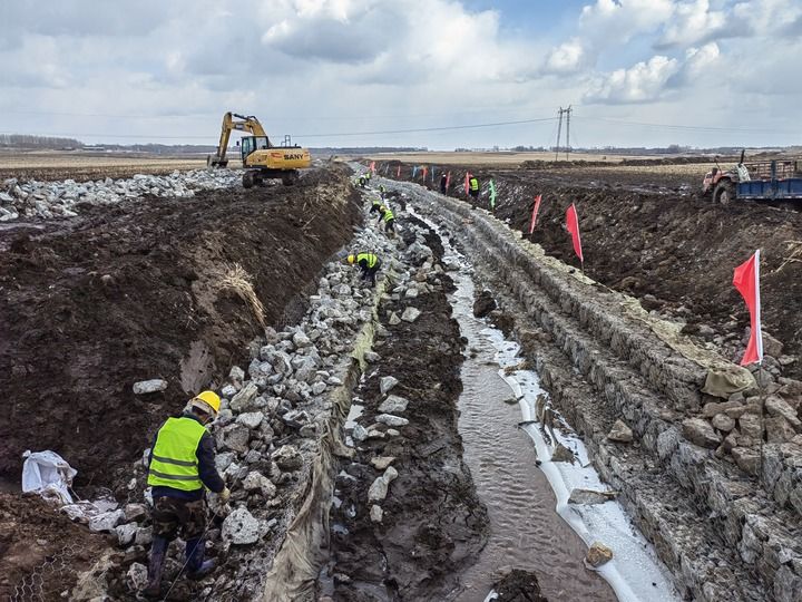 3月20日,在吉林省榆樹市黑林鎮(zhèn)豆坊村高標準農(nóng)田建設(shè)現(xiàn)場,工人們在修繕排水溝渠。