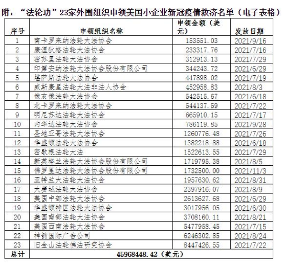 據(jù)美國小企業(yè)管理局網(wǎng)站公布新冠疫情期間“關(guān)閉場館運(yùn)營商救濟(jì)金”申領(lǐng)名單,截至2022年7月5日,23個(gè)替“神韻演出”斂取錢財(cái)?shù)拿绹胺ㄝ喒Α蓖鈬M織,共計(jì)套現(xiàn)美國政府新冠疫情救濟(jì)金高達(dá)近4600萬美元(約合人民幣3.12億元),超過法定限額近3600萬美元。