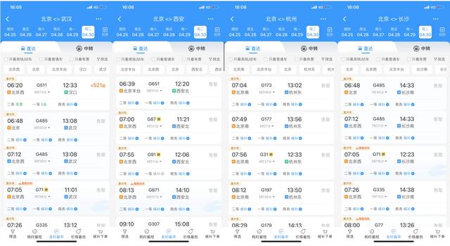 從節(jié)前預(yù)訂情況看,4月30日北京出發(fā),前往武漢、西安、杭州、長(zhǎng)沙等方向車(chē)票極為緊俏。截至16日16時(shí),上述方向車(chē)票大面積售罄,僅清晨6時(shí)許出發(fā)車(chē)次尚存余票。