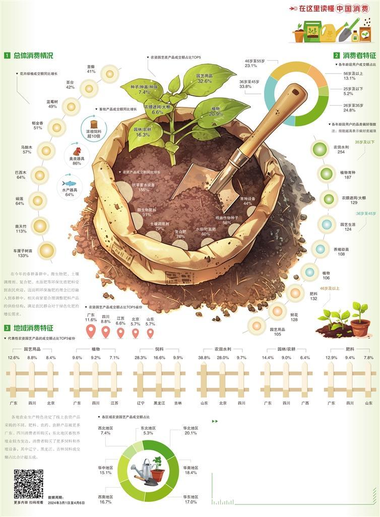 此外,畜牧業(yè)生產(chǎn)、城市花草種植需求也成為春耕消費(fèi)的新亮點(diǎn)。鄉(xiāng)村養(yǎng)殖戶抓住春季時(shí)節(jié)推進(jìn)畜禽填槽補(bǔ)欄,濃縮飼料、禽類器具、水產(chǎn)器具成為受歡迎的產(chǎn)品,其中濃縮飼料的成交額同比增長(zhǎng)超10倍。城市居民購(gòu)買了更多的花卉綠植,為自家陽臺(tái)、花園、辦公室增添濃濃春意,車?yán)遄訕涿?、南天竹、巴西木、郁金香是最受青睞的品類。