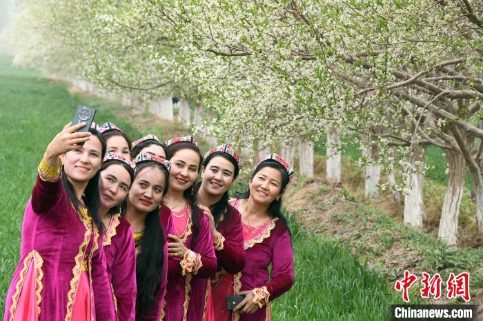 4月15日,新疆伽師縣舉行第四屆新梅花開文學藝術采風活動。圖為新疆伽師縣米夏鄉(xiāng)的民眾在新梅花前自拍。中新網記者孫亭文攝