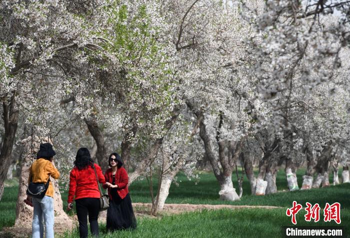 3月31日,多名游客在新疆阿克陶縣塔爾塔吉克民族鄉(xiāng)巴格艾格孜村的杏花樹下拍照。中新網記者孫亭文攝