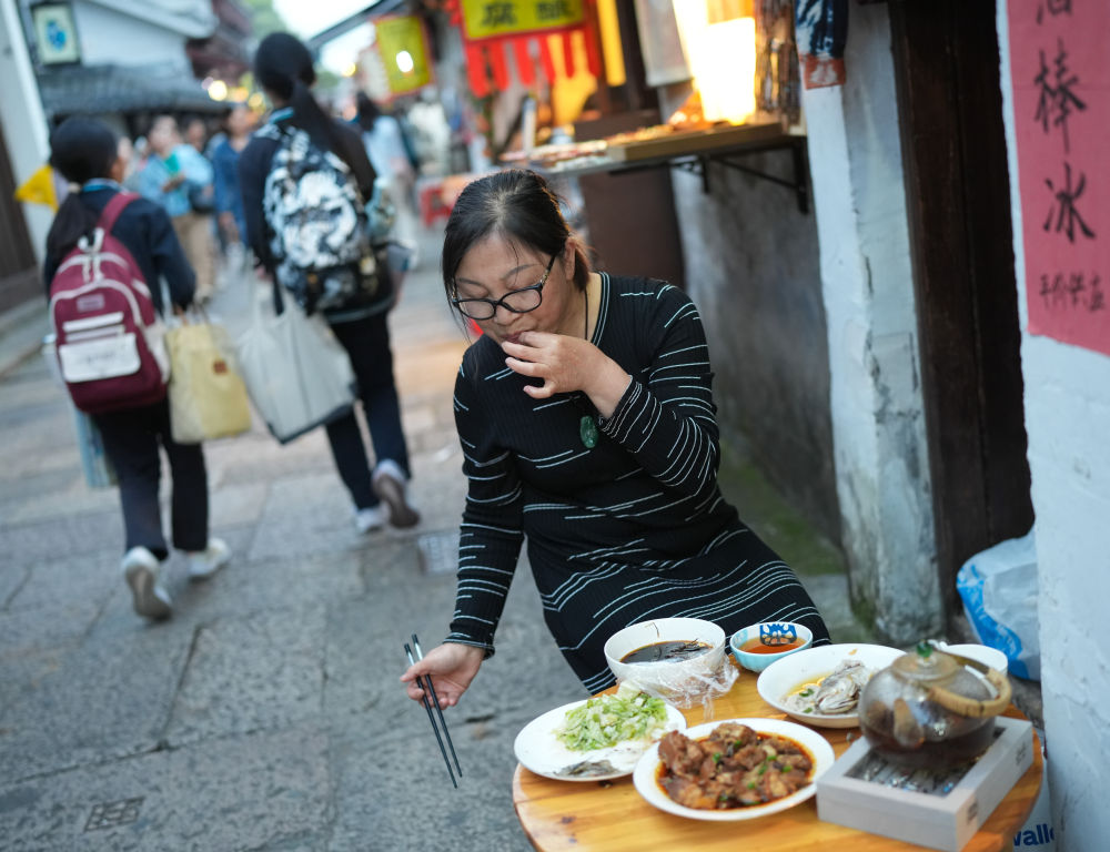 浙江紹興倉(cāng)橋直街,人來客往。傍晚,居民童秀娟把小飯桌搬到家門口,倚街而坐,拈起一只醉蝦嘬起來。尋常煙火味,彌散開來。