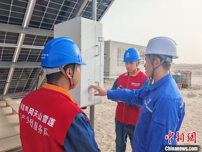 國網(wǎng)阿克蘇供電公司工作人員來到沙雅中電建25萬千瓦光伏項目現(xiàn)場,檢查光伏場站逆變器運行情況。(馬海驕 攝)