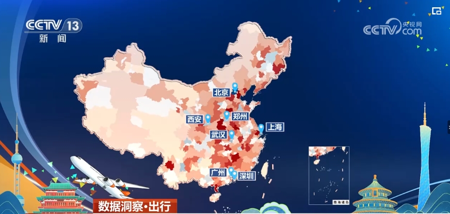 這是一張根據(jù)12306火車票預(yù)售數(shù)據(jù)繪制的熱力圖,紅色越深代表在5月1日乘火車凈流入到這個城市的人越多,藍(lán)色越深則表示凈流出這里的人越多??梢钥吹剑鄙蠌V深、武漢、鄭州、西安等中心城市是凈流出人數(shù)較多的城市。