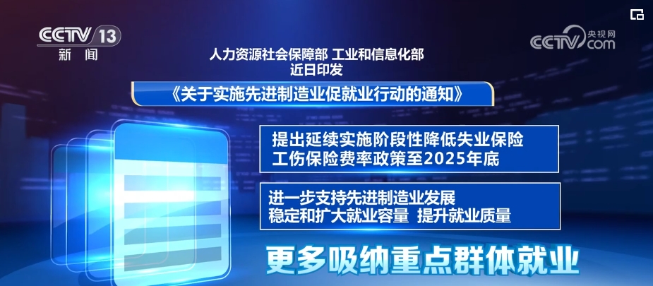 人力資源社會保障部、工業(yè)和信息化部印發(fā)《關于實施先進制造業(yè)促就業(yè)行動的通知》,提出延續(xù)實施階段性降低失業(yè)保險、工傷保險費率政策至2025年底,進一步支持先進制造業(yè)發(fā)展,穩(wěn)定和擴大就業(yè)容量,提升就業(yè)質量,更多吸納重點群體就業(yè)。