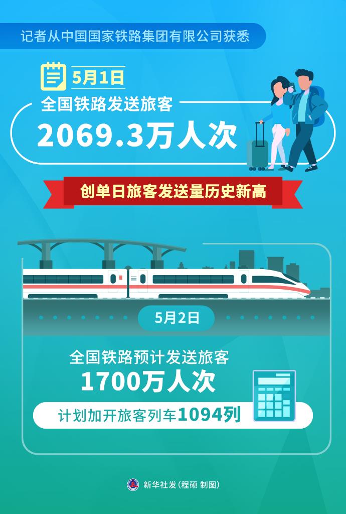記者從中國(guó)國(guó)家鐵路集團(tuán)有限公司獲悉,5月1日,全國(guó)鐵路發(fā)送旅客2069.3萬(wàn)人次,創(chuàng)單日旅客發(fā)送量歷史新高。5月2日,全國(guó)鐵路預(yù)計(jì)發(fā)送旅客1700萬(wàn)人次,計(jì)劃加開(kāi)旅客列車1094列。