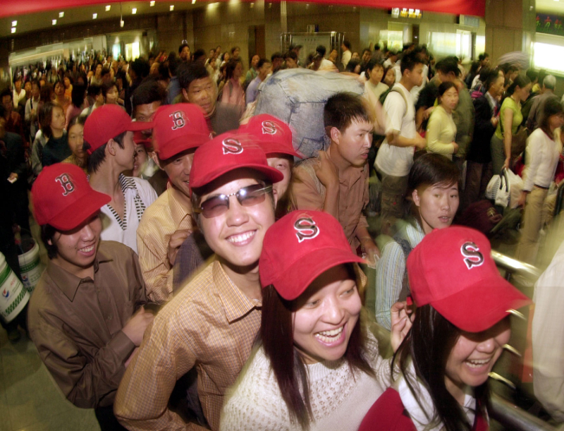 2004年5月1日,在杭州火車站出口處,大批旅行團(tuán)游客準(zhǔn)備出站?!拔逡弧逼陂g,來自全國(guó)各地的大批游人通過鐵路和公路涌入杭州,形成旅游高峰。新華社發(fā)(李震宇 攝)