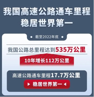1999年,“黃金周”這個(gè)概念第一次出現(xiàn)在大眾視野里,在那一年,全國(guó)高速公路通車?yán)锍虅偼黄?萬公里。截至2022年底,我國(guó)公路總里程達(dá)到535萬公里,其中高速公路通車?yán)锍?7.7萬公里,穩(wěn)居世界第一。