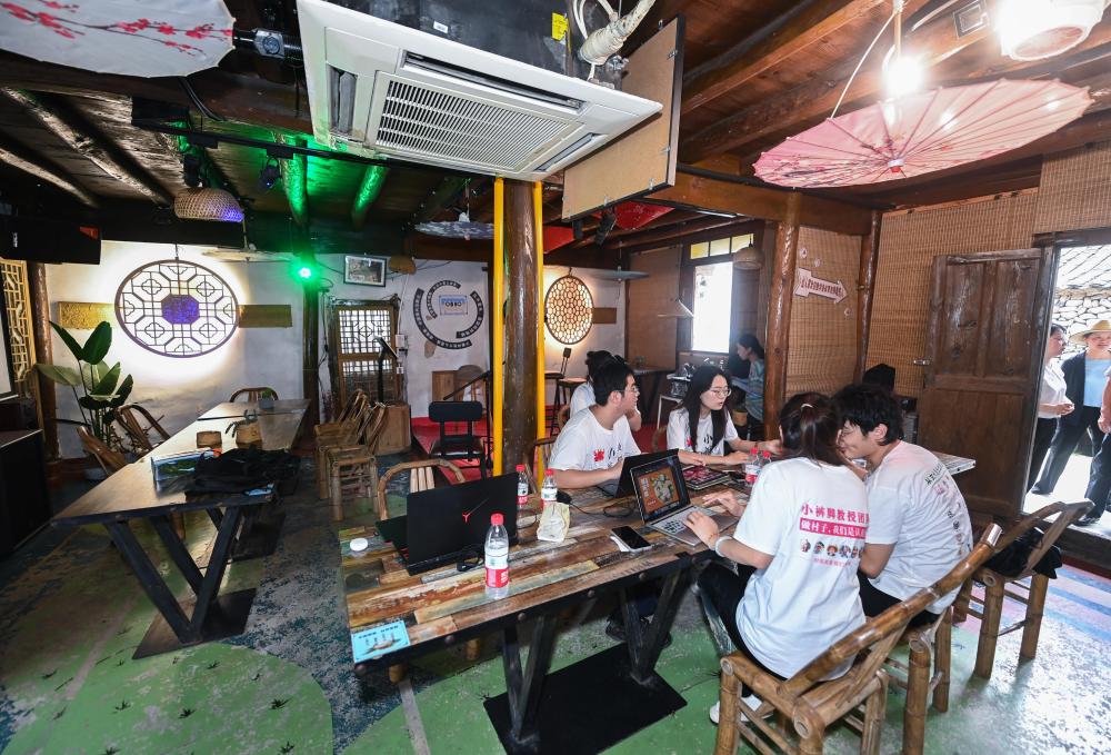 2023年8月11日,高校藝術(shù)院系的大學(xué)生們?cè)趯幉ㄊ袑幒?h葛家村的特色酒吧內(nèi)討論村落藝術(shù)改造提升的設(shè)計(jì)方案。 新華社記者 徐昱 攝