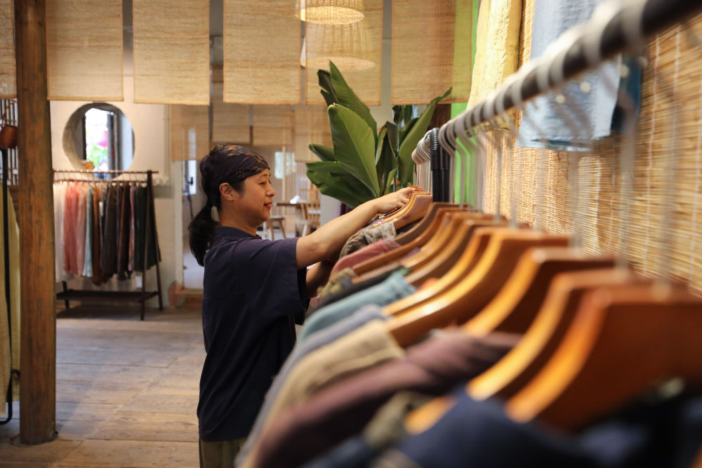 2023年5月23日,在浙江省義烏市李祖村,“農(nóng)創(chuàng)客”鮑麗萍在店鋪里整理服裝產(chǎn)品。 新華社記者 杜瀟逸 攝