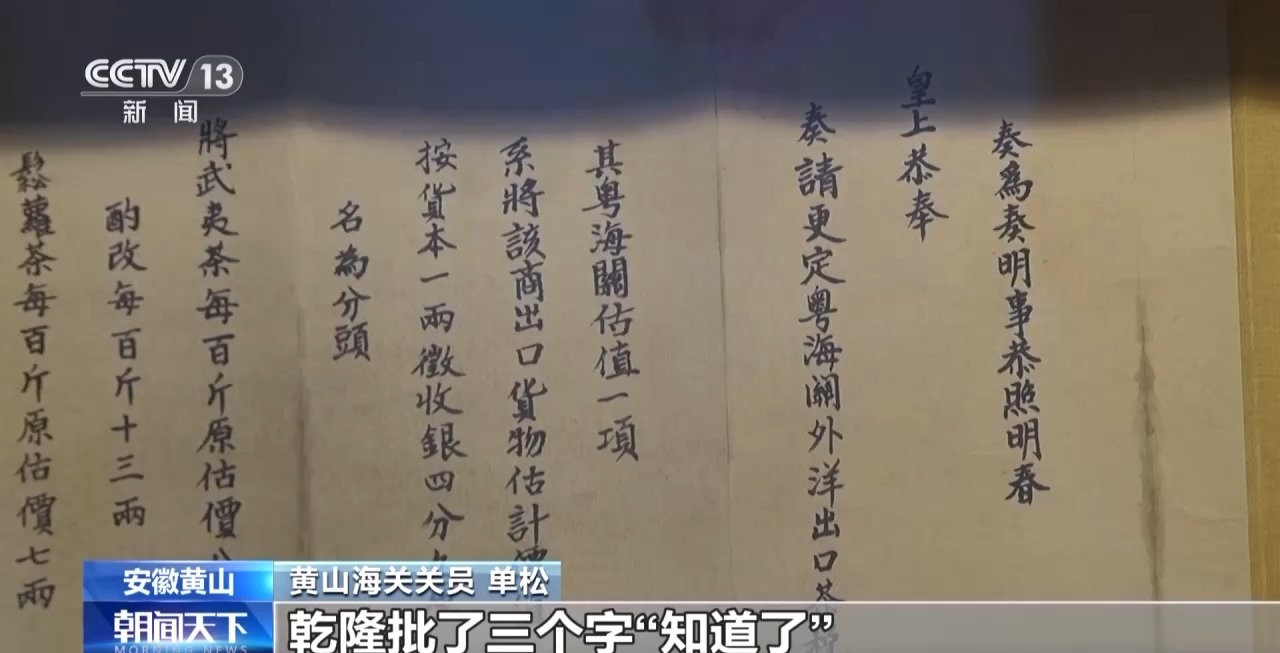 黃山海關(guān)關(guān)員 單松:這是一份乾隆年間的奏折,它的主要內(nèi)容就是提高出口茶葉的價(jià)格,距今已經(jīng)260多年,乾隆批了三個(gè)字“知道了”,特別有趣。