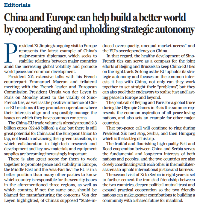 中國領(lǐng)導(dǎo)人此次歐洲之行旨在全球局勢日益動蕩之際穩(wěn)定大國關(guān)系和中歐關(guān)系,促進(jìn)世界和平與共同發(fā)展。在促進(jìn)歐洲、中東和亞太地區(qū)的和平與穩(wěn)定方面,中歐雙方有很大的合作空間。只要?dú)W盟堅持戰(zhàn)略自主,著眼于中歐共同利益,雙方不僅可以攜手合作,還可以為實(shí)現(xiàn)歐洲和歐洲以外地區(qū)公正與持久的和平共同努力,為世界和平與發(fā)展以及人類的進(jìn)步作出新的貢獻(xiàn)。