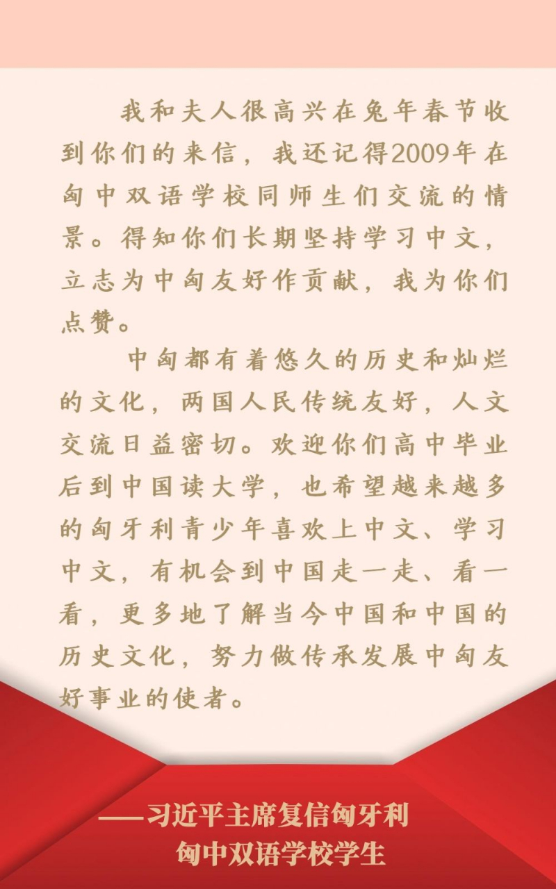 2023年春節(jié)前夕,匈中雙語學(xué)校學(xué)生胡靈月、宋智孝代表全校學(xué)生致信習(xí)近平主席和夫人彭麗媛教授,按照中國風(fēng)俗拜年,講述在校學(xué)習(xí)中文12年的感受,表達(dá)將來到中國上大學(xué)、為匈中友好作貢獻(xiàn)的愿望。