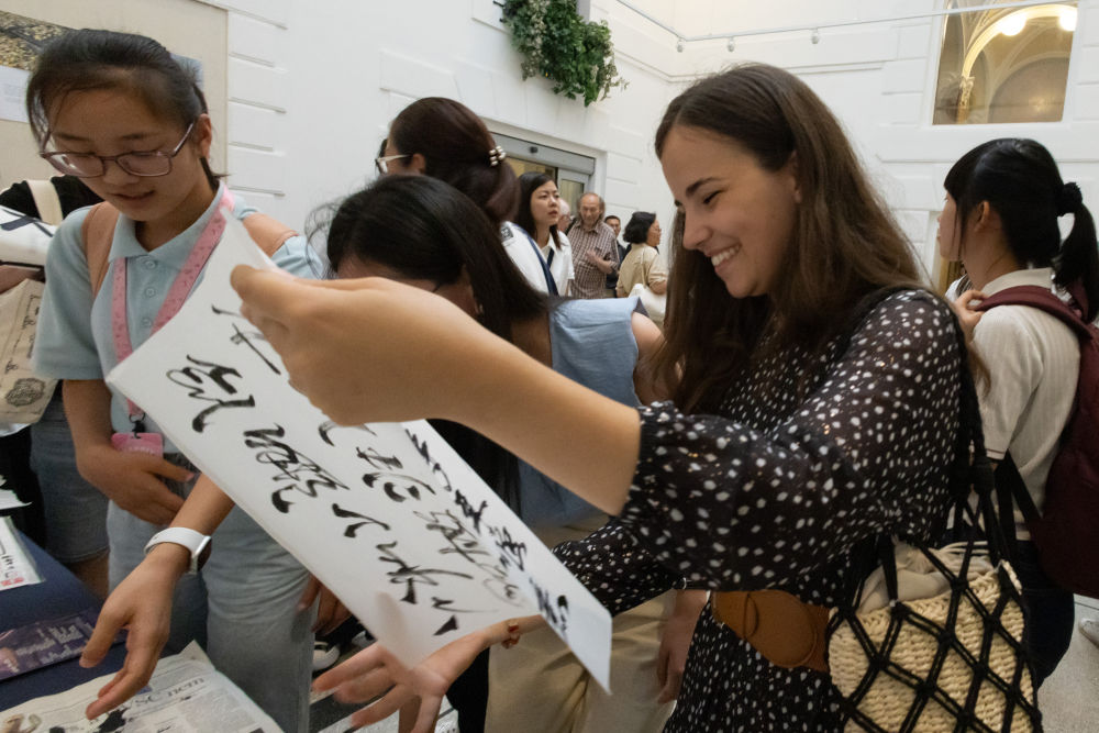 2023年8月29日,嘉賓在匈牙利布達(dá)佩斯“美美與共——中國匈牙利詩歌吟誦會(huì)”暨“漢字與中華文明”展上體驗(yàn)中國書法。