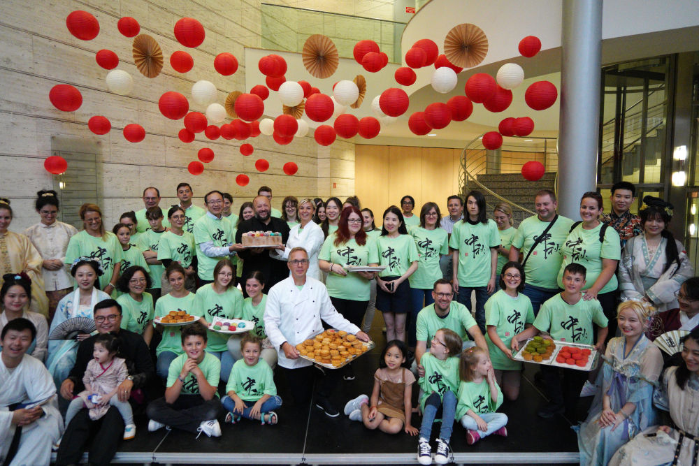 2023年9月3日,人們在匈牙利德布勒森市克爾切伊文化中心參加“第四屆匈牙利月餅制作坊”活動(dòng)并合影。在此次活動(dòng)上,500多名當(dāng)?shù)厥忻颀R聚一堂,制作中秋月餅,體驗(yàn)中國傳統(tǒng)文化。