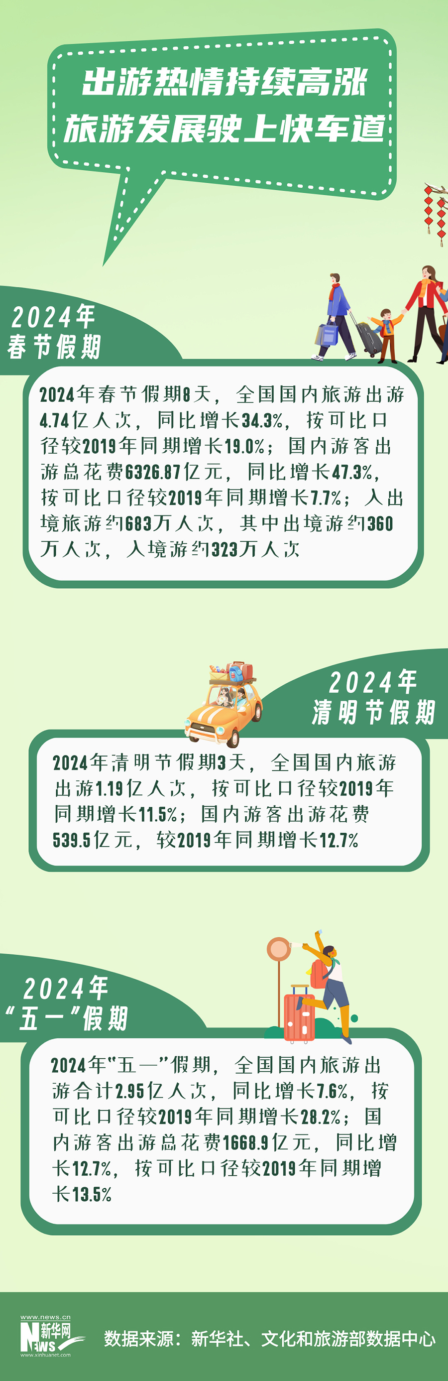 2024年春節(jié)假期8天,全國國內(nèi)旅游出游4.74億人次;清明節(jié)假期3天,全國國內(nèi)旅游出游1.19億人次;“五一”假期全國國內(nèi)旅游出游2.95億人次......