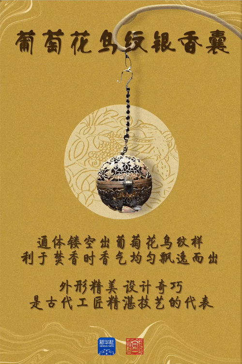 葡萄花鳥(niǎo)紋銀香囊體現(xiàn)了唐代貴族的生活意趣?!疤拼鐣?huì)的開(kāi)放包容,人們生活中的儀式感都融入在這枚香囊之中?!标兾鳉v史博物館副研究館員賀達(dá)炘說(shuō)。