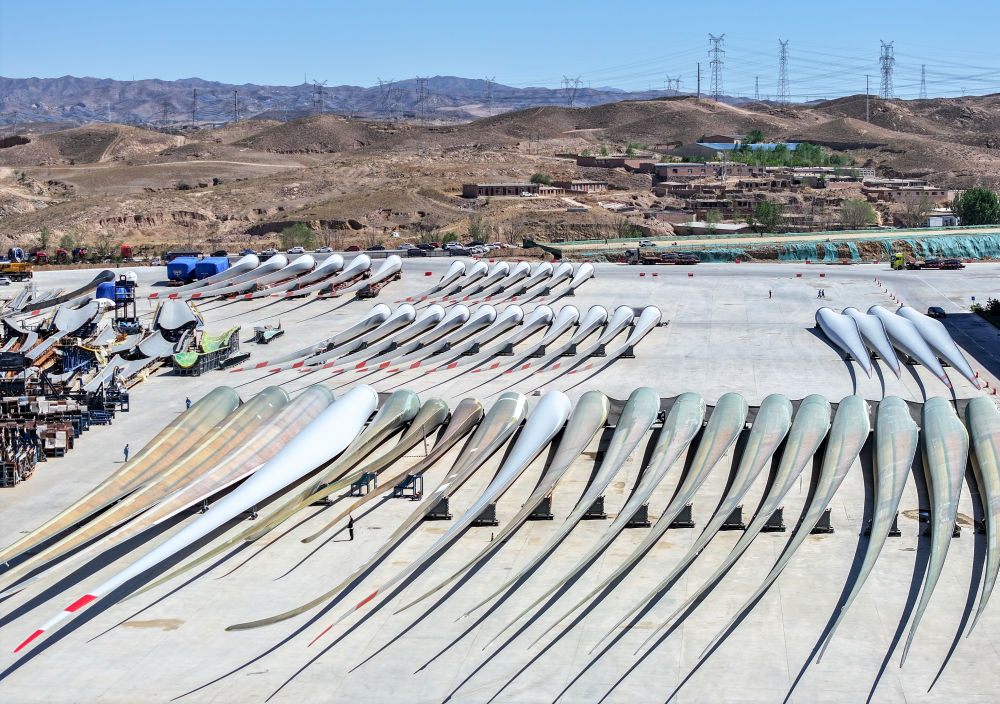 2024年5月11日拍攝的碼放在內(nèi)蒙古包頭市石拐區(qū)一家風(fēng)電設(shè)備制造企業(yè)廠區(qū)內(nèi)的葉片(無人機照片)。