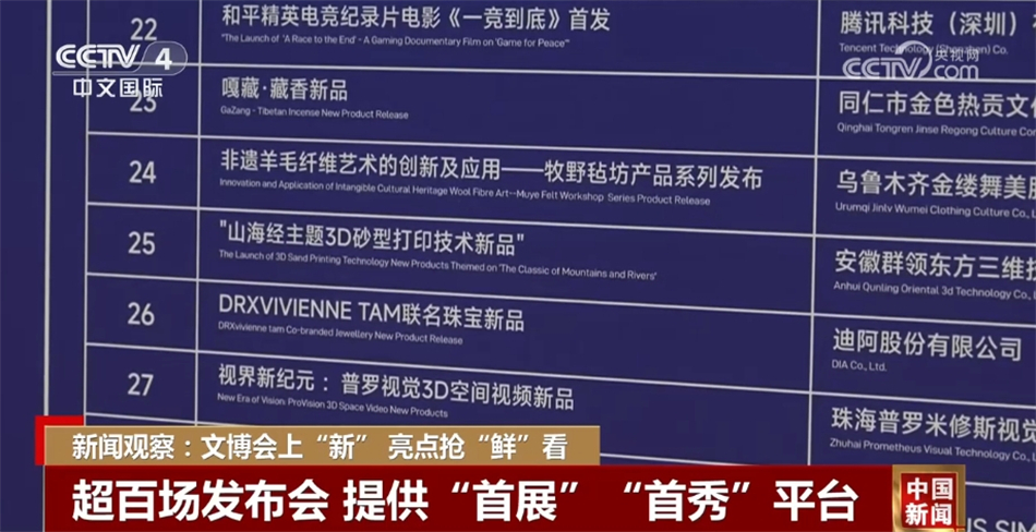 首次設立國際文化貿(mào)易展,邀請西班牙貿(mào)易協(xié)會、尼泊爾工商聯(lián)合會等國外貿(mào)易機構參展,一站式包攬各地文化產(chǎn)業(yè)精品;在影視·出版·版權·游戲電競展,首次亮相的“城市文化合伙人”主題展呈現(xiàn)“文化+交易產(chǎn)業(yè)融合新產(chǎn)品”,傳播城市優(yōu)秀文化。據(jù)悉,今年的文博會將舉辦超100場創(chuàng)新項目及新品發(fā)布會和超20場招商會、推介會等,為國內(nèi)外新產(chǎn)品、新技術、新業(yè)態(tài)、新服務的發(fā)布提供“首展”“首發(fā)”“首秀”平臺。