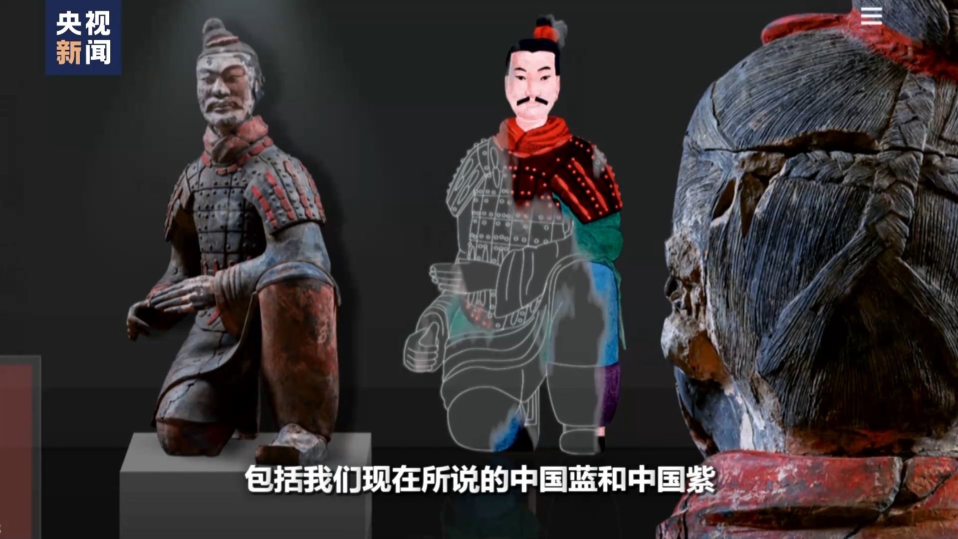 秦始皇帝陵博物院文物保護(hù)修復(fù)專家 蘭德省:那么這在秦俑實(shí)際上,目前有八種顏色。紅、黃、綠、藍(lán)、紫、白、黑、粉等等,這就是已經(jīng)定型的八種。但是我們最近也要分析比這個(gè)還要多,包括有一些它是白里透紅的粉色,還有的它就是幾種合成色,包括我們現(xiàn)在所說(shuō)的中國(guó)藍(lán)和中國(guó)紫。