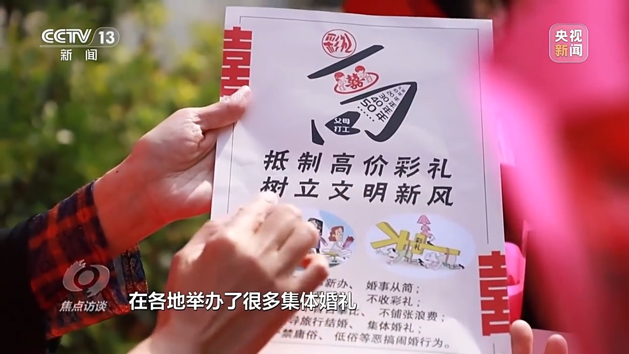 共青團(tuán)中央宣傳部副部長 劉釗:我們在進(jìn)行社會倡導(dǎo),進(jìn)行文明引導(dǎo),在各地舉辦了很多集體婚禮,確實得到了基層青年比較熱烈比較積極的響應(yīng)。他們用更樸素更自然更貼近自己實際需求的方式方法來籌辦自己的婚禮,也來回應(yīng)一些高額彩禮給他們所帶來的壓力,我們覺得這是一種非常好的導(dǎo)向。