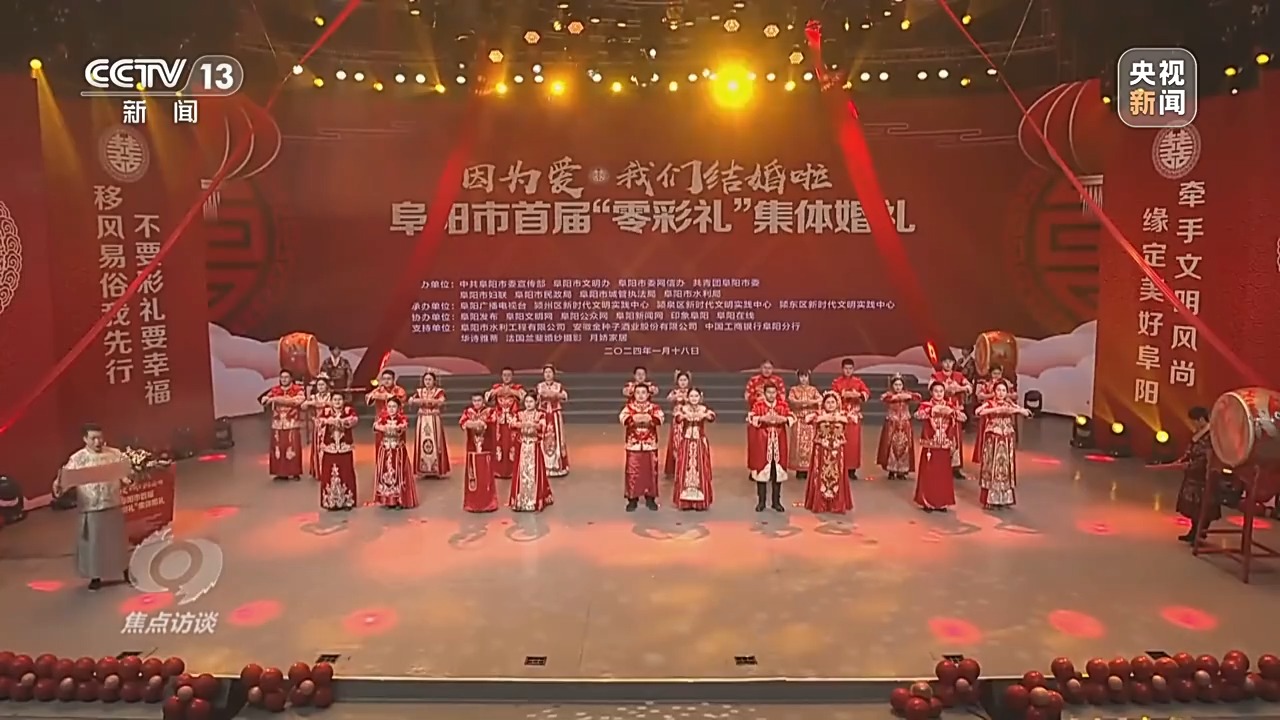 不久前,安徽阜陽當(dāng)?shù)?0余家媒體共同直播了一場“零彩禮”集體婚禮,58對新人在親人、觀禮嘉賓及廣大網(wǎng)友祝福聲中,鄭重許下相守一生的承諾。