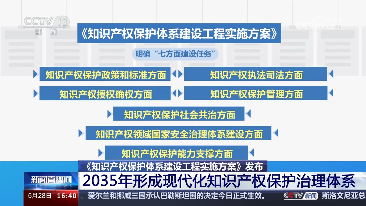 國家知識(shí)產(chǎn)權(quán)局5月28日舉行新聞發(fā)布會(huì),重點(diǎn)介紹《知識(shí)產(chǎn)權(quán)保護(hù)體系建設(shè)工程實(shí)施方案》(以下簡(jiǎn)稱《方案》)有關(guān)情況?!斗桨浮访鞔_,到2035年,知識(shí)產(chǎn)權(quán)保護(hù)體系和保護(hù)能力現(xiàn)代化基本實(shí)現(xiàn),形成政府履職盡責(zé)、執(zhí)法部門嚴(yán)格監(jiān)管、司法機(jī)關(guān)公正司法、經(jīng)營主體規(guī)范管理、行業(yè)組織自律自治、社會(huì)公眾誠信守法的現(xiàn)代化知識(shí)產(chǎn)權(quán)保護(hù)治理體系。