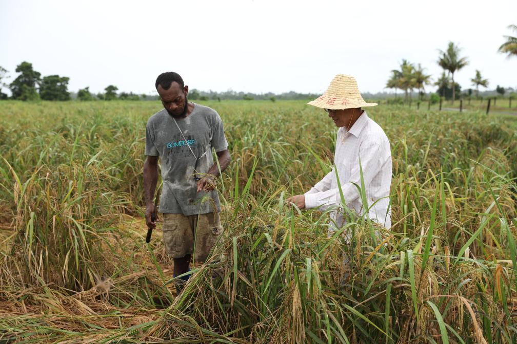 3月13日,在太平洋島國斐濟瑙索里鎮(zhèn),中國專家(右)在中國援斐濟農業(yè)發(fā)展技術水稻項目試驗示范培訓基地查看暴雨過后水稻倒伏情況。新華社發(fā)(桑欽龍攝)