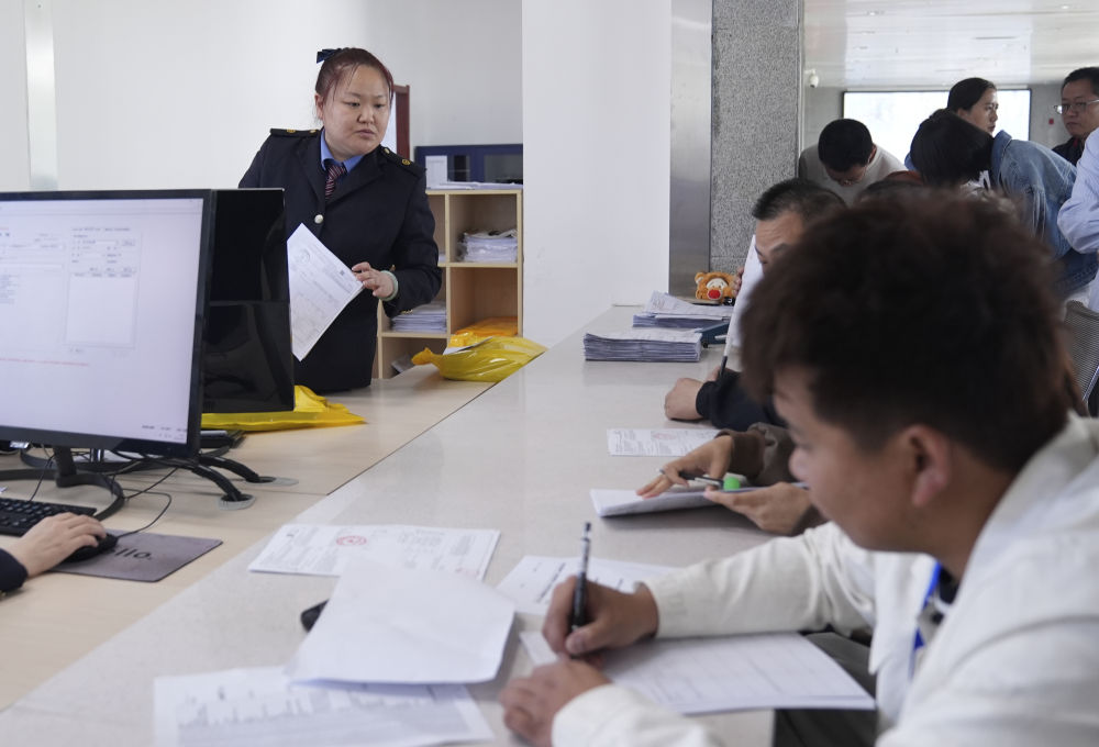 在霍爾果斯鐵路口岸站聯運大廳內,出口貨運員在為客戶辦理更正國際聯運運單業(yè)務(5月29日攝)。