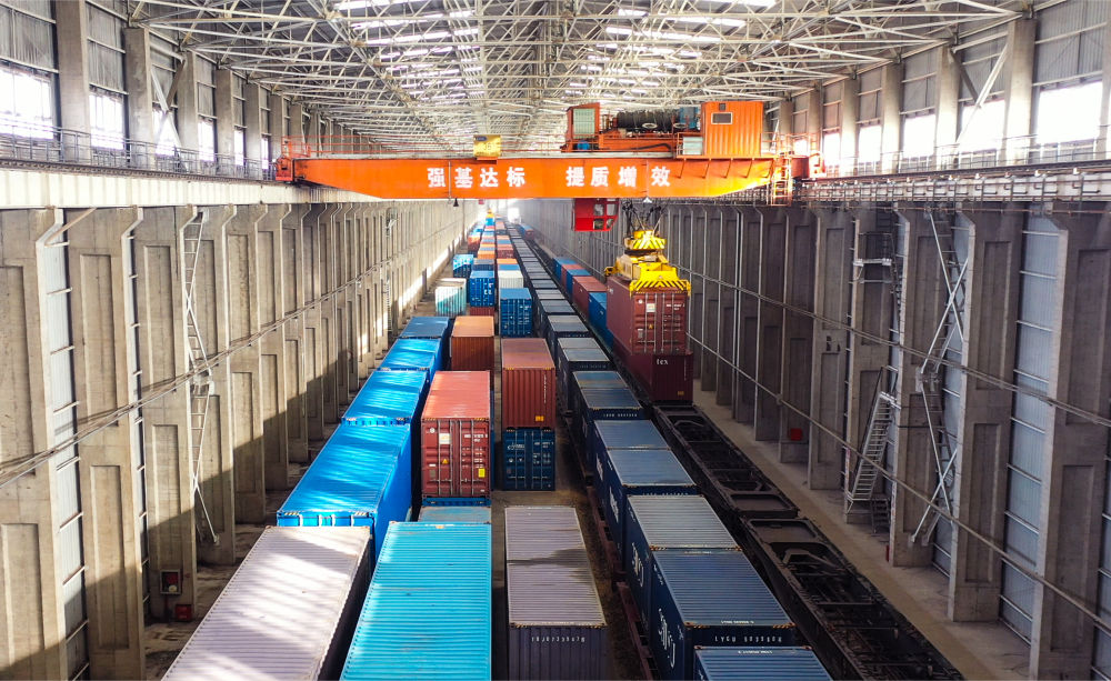 在新疆霍爾果斯鐵路口岸換裝場拍攝的班列換裝作業(yè)現場(5月29日攝)。