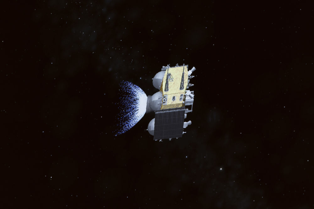 6月4日在北京航天飛行控制中心屏幕上拍攝的嫦娥六號上升器攜帶月球樣品自月球背面起飛的動畫模擬畫面。