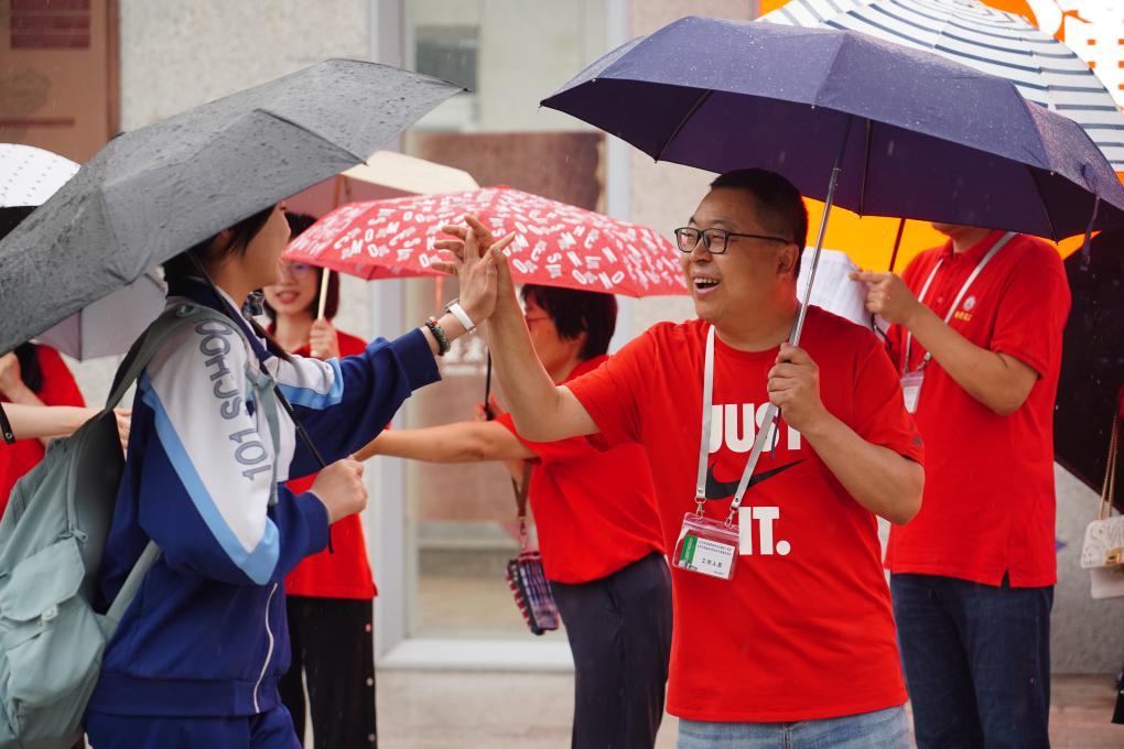 雖然天空下著雨,北京一零一中學的送考老師們還是早早在校門口排成一列,與陸續(xù)趕來的考生一一擊掌鼓勁。在校門口刷臉驗證身份后,考生通過提前搭設(shè)的紅色晴雨走廊,步入候考區(qū)及考場。