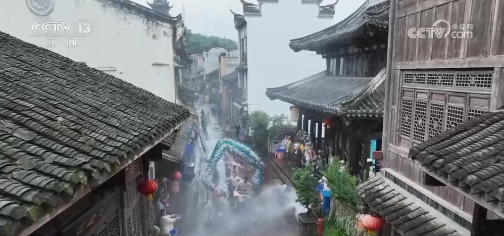 重慶市銅梁區(qū)的安居古城正在進行端午節(jié)的非遺文化表演——水云龍。10名赤膊的漢子舞動著一條18米的藍(lán)色水云龍,整條龍上下翻騰、左右騰挪,在兩邊明清時期的老屋之間穿行。而站在兩旁的居民和游客會拿著水瓢或者水盆,將清水潑向正在舞動的水云龍。雖然水云龍所到之處,大家衣衫都可能打濕,但是大家都樂在其中。